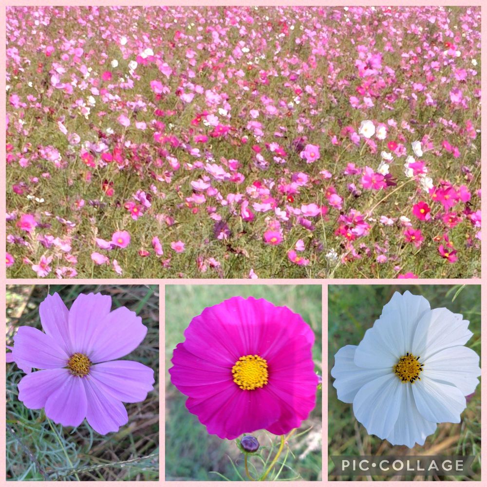 コスモス畑、沢山のコスモスがユラユラ咲いて素敵な光景ですね〜🩷🤍
