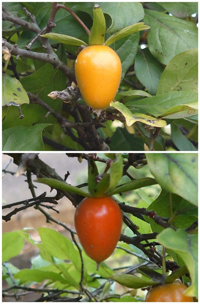 黄も赤もタテ3cmくらいかな。プチ柿のロウヤガキです😀 中身はほとんどタネみたいです😬 鑑賞用ですね(農業試験場内にて)