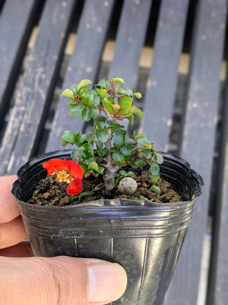 八房長寿梅ミニ盆栽苗木。四季咲きなので花も付いてる。