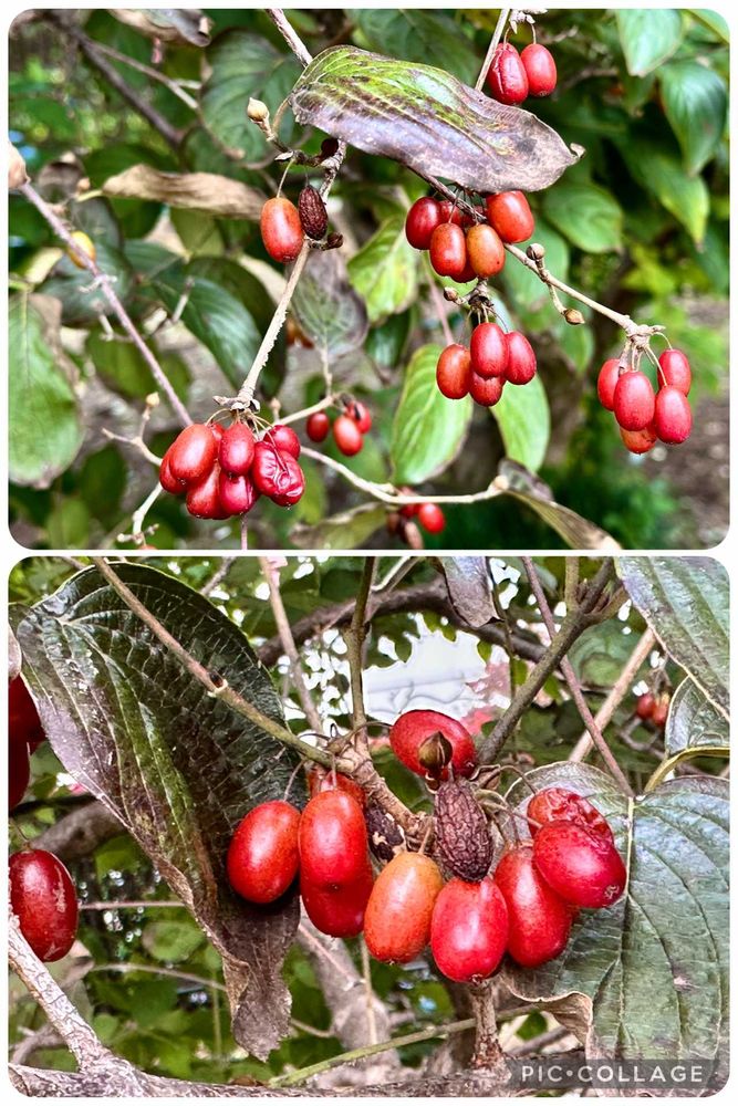見事に真っ赤な実が鈴なりになっているのは、サンシュユです😍
