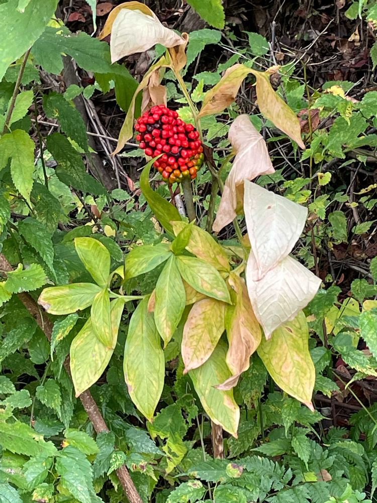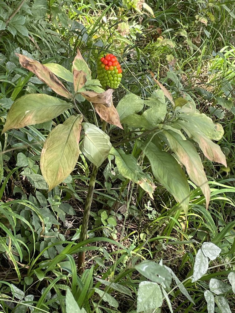 マムシグサの実は、最初は緑色ですが、秋(9月から10月頃)にかけて黄色から橙色、そして最終的に真っ赤に熟します。実の着き方はトウモロコシの小さい版ですが、シュウ酸カルシウムなどの有毒成分を含んでおり、食べると激しい痛みや炎症を引き起こすため大変危険⚠️😱