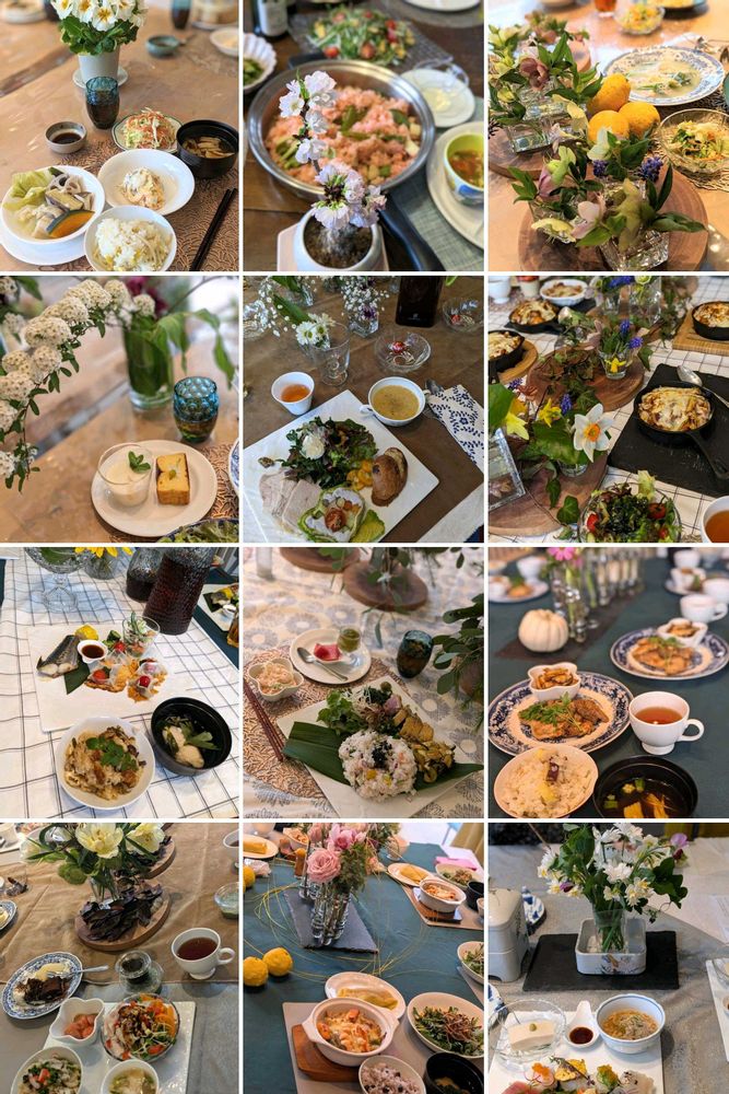 Googleフォトが「似ている写真や動画」と題してコラージュしてくれました🍀😊✨2023年〜2025年🧑🍳お料理教室とお友達の🏠にお花が飾っていましたψ(´ڡ`♡) オイシー♪