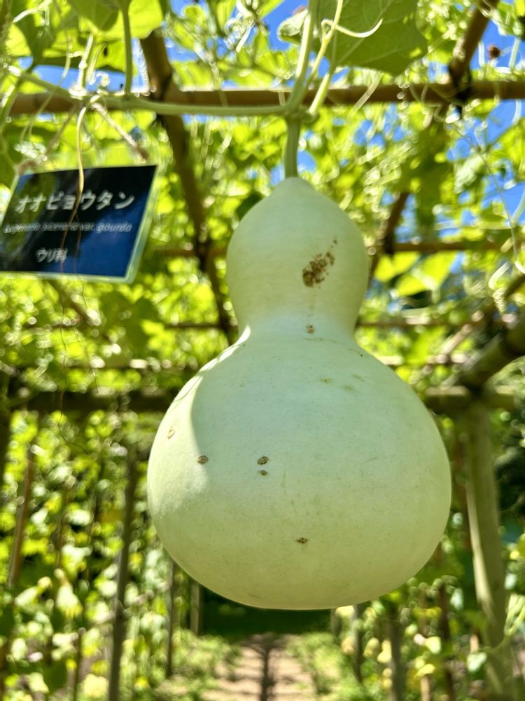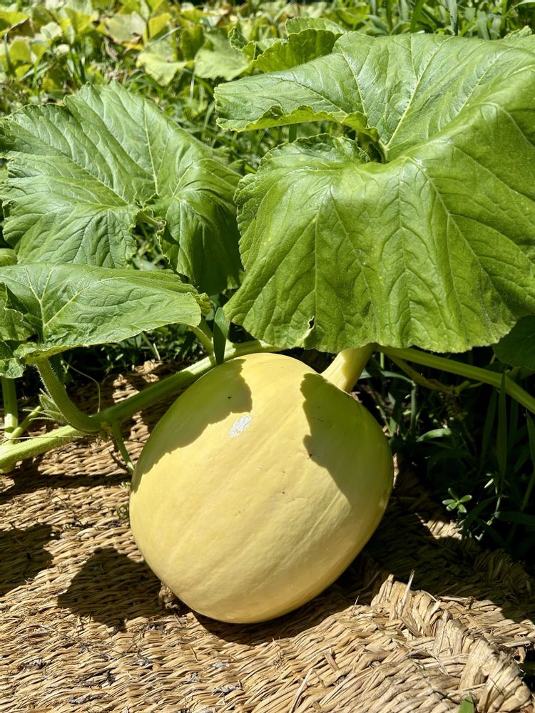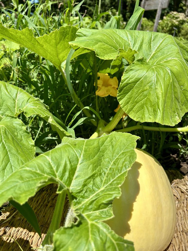 既にかなり大きくなったハロウィンカボチャ"アトランティックジャイアント"まだまだ巨大化する予定❣️ムシロは早めに敷いておかないと持ち上がらなくなる💦葉の影にちゃっかりウリ科の黄色の花。カボチャ畑の隣の棚にはオオビョウタン。同じ黄色い花です。