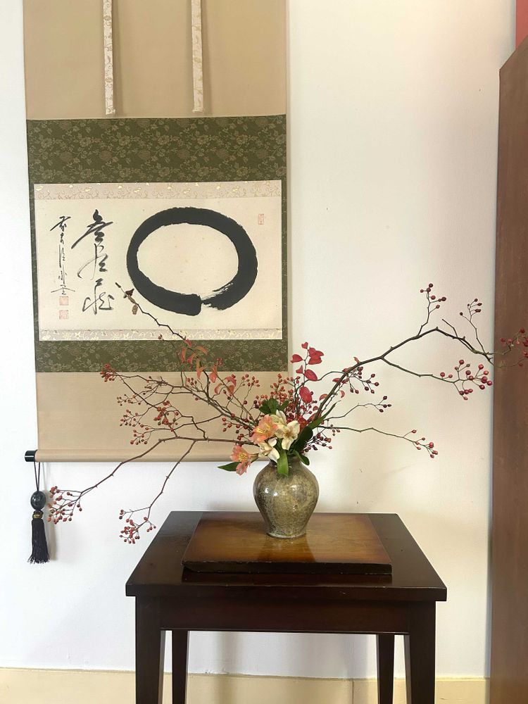 この時の枝は思いきり広がっていますね〜。深いどっしりした器なので受け止めてもらえました。明るい色やガラスでは収まりが悪かったと思います。