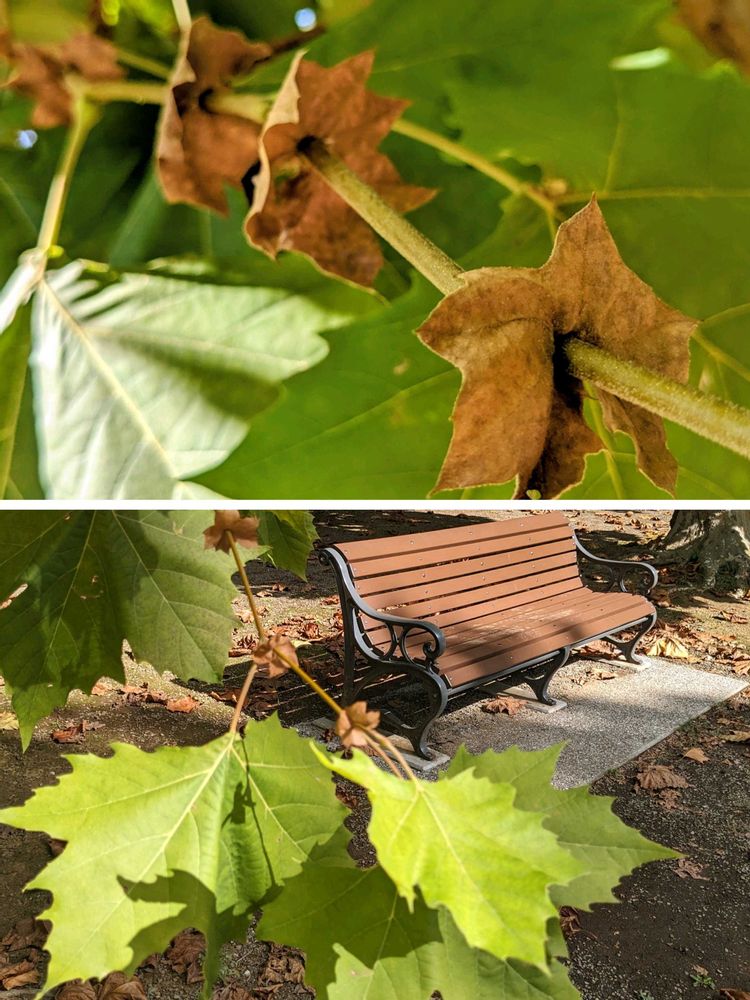 ③ そのモミジバスズカケノキの托葉が、茶色く色づき、連なってました🟤