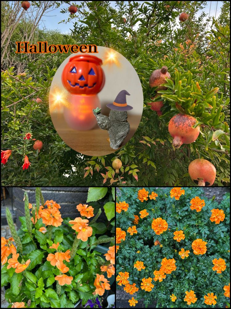 【今日のお花:カボチャ】透かしホオヅキ、ミズヒキ、アジサイ、ザクロ、クロッサンドラ、マリーゴールド