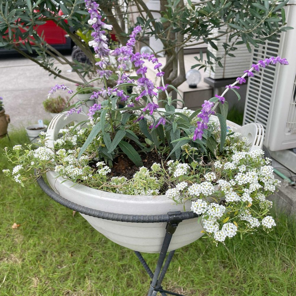 モニターで提供いただいた「メキシカンブッシュセージ ステラ」2ボットをスーパーアリッサムの鉢に寄せ植えにしました。。