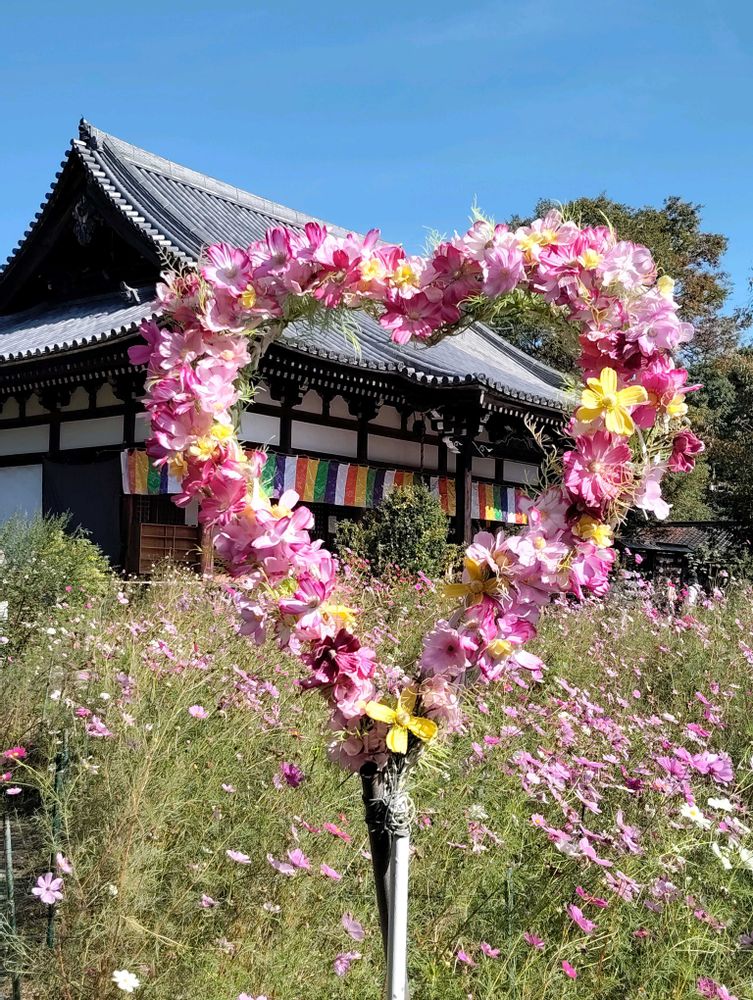 お寺にコスモスなの?
