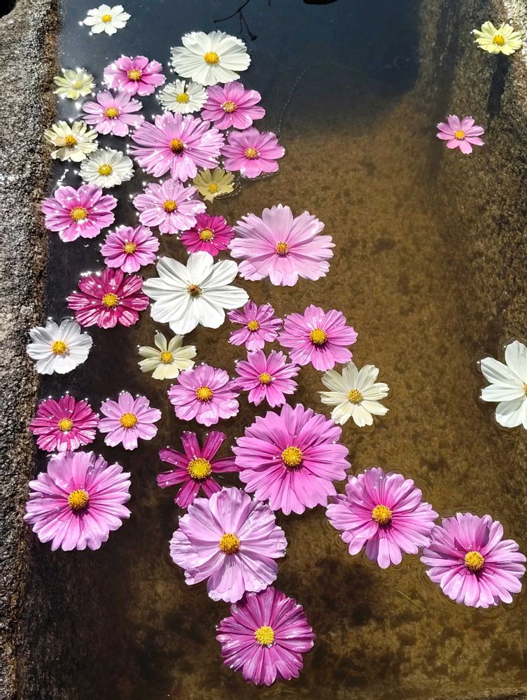 花手水のコスモス素敵𖤣𖥧𖥣。𖥧 𖧧𖤣𖥧𖥣。𖥧 𖧧