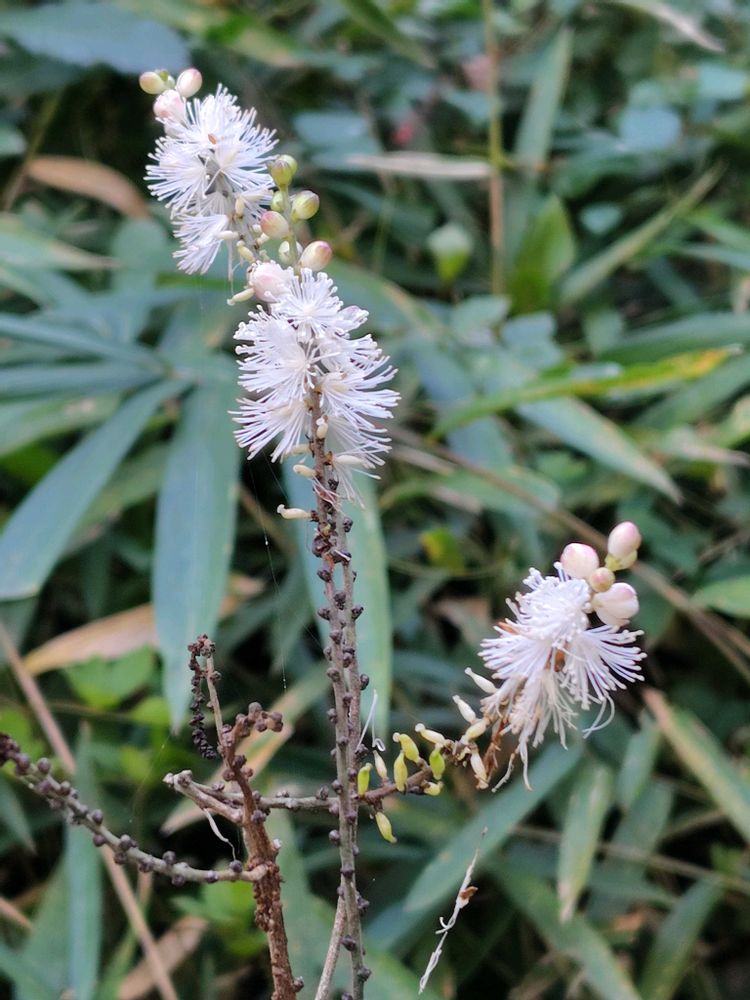 枝先に長さ20〜30cmの穂状花序を出し、白色の花を多数付ける。