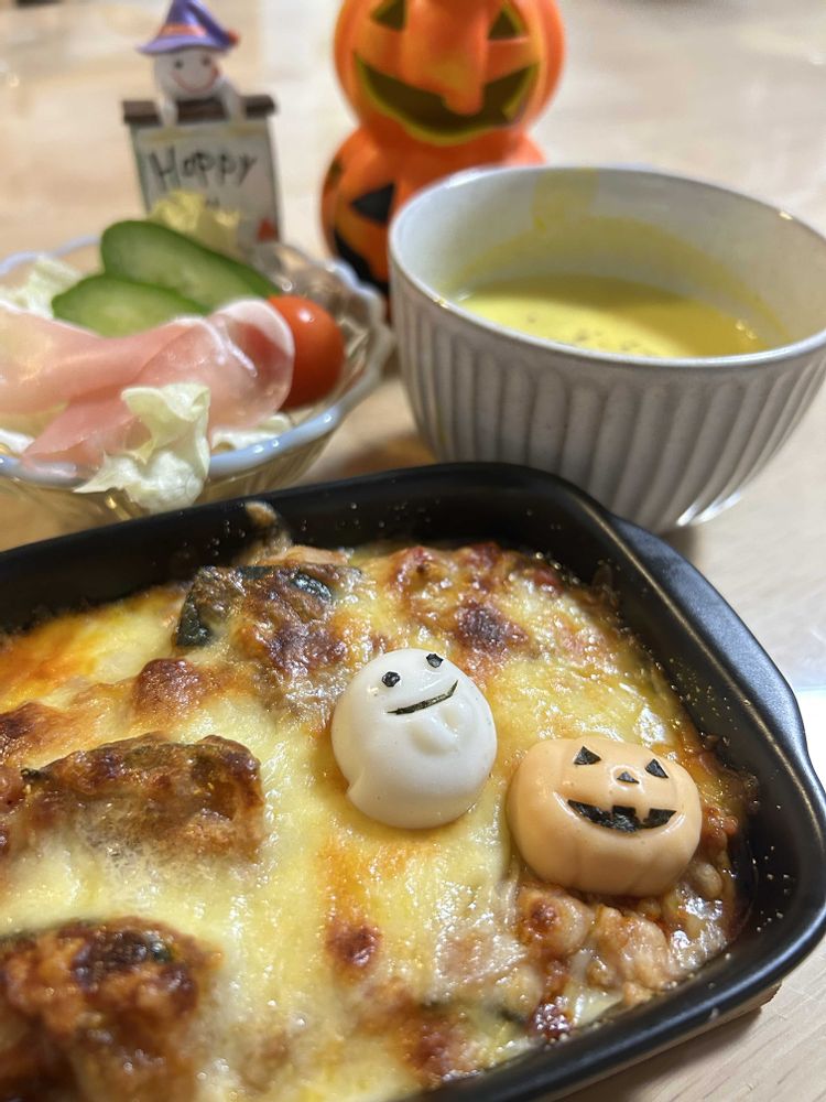 グラタンには昨日スーパーで安くなっていたカボチャとオバケのかまぼこを乗せました🎃👻