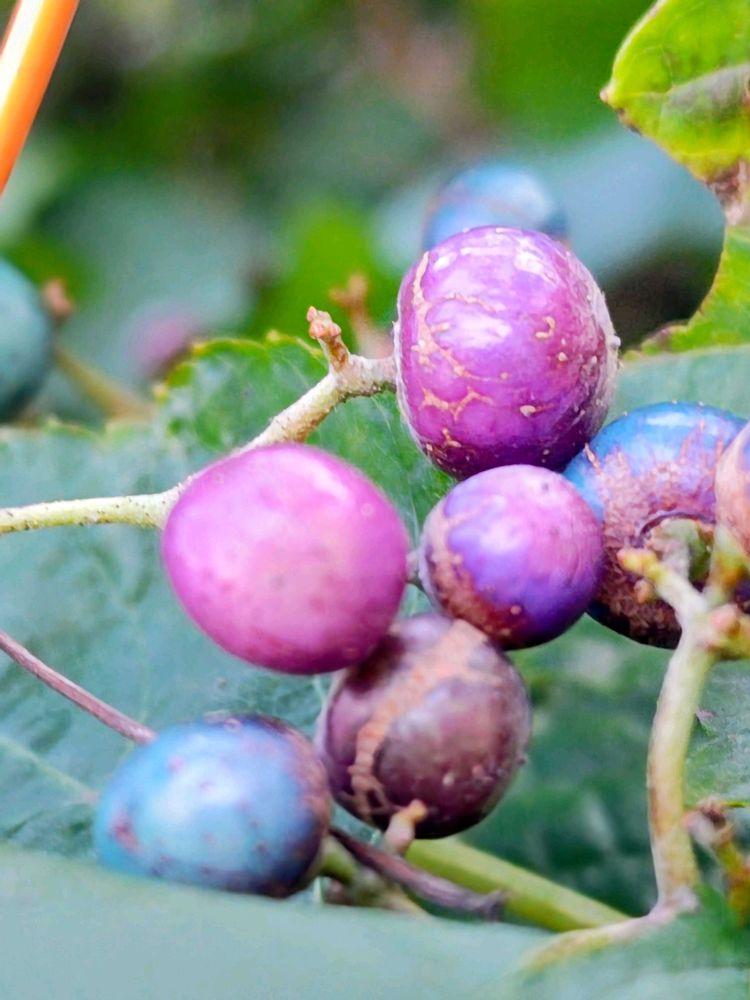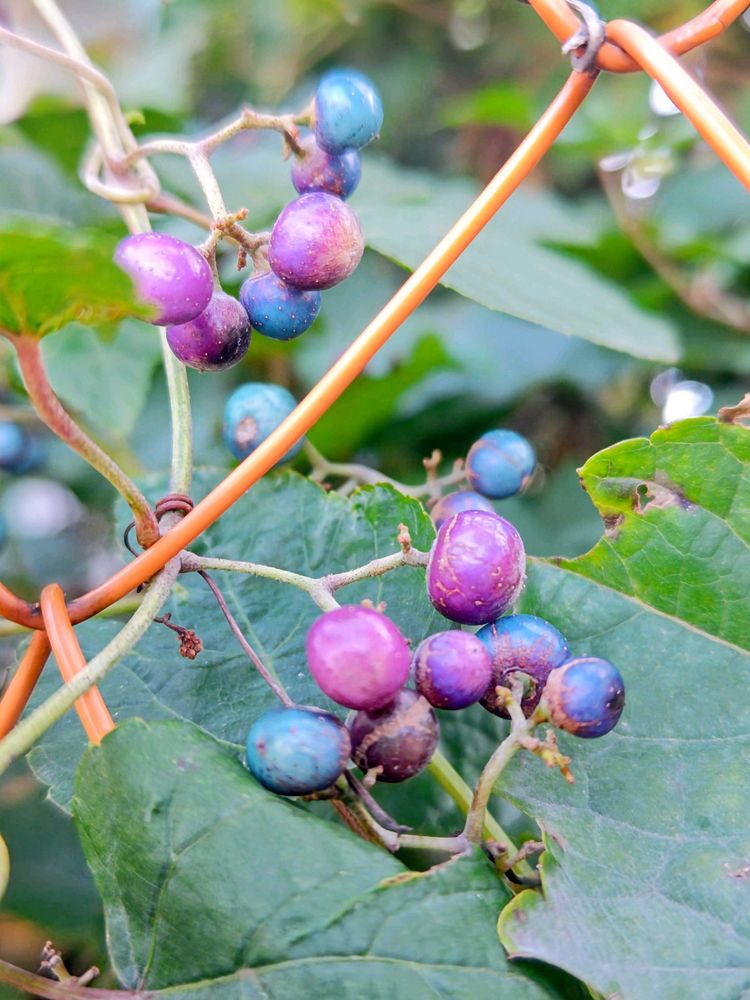 散歩道でノブドウの実が、鮮やかに色づいてました。