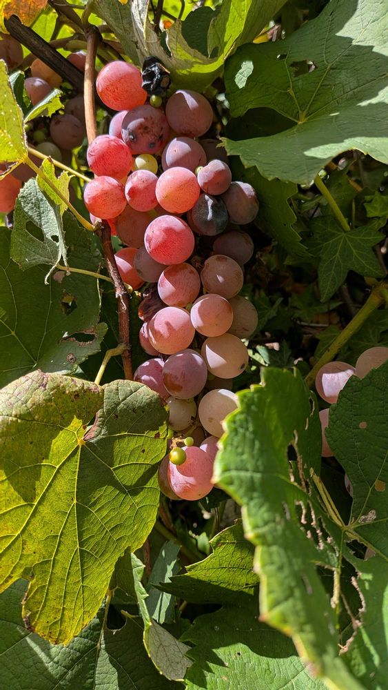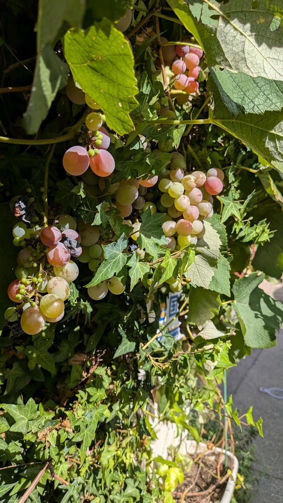 この道を通りはじめて20年なるのですが、🍇ブドウの房がなっているのを見て、ブドウ棚でなくても育てられるのだなぁと思いました。最初の段階でつる性を利用して誘導したのでしょうね。
