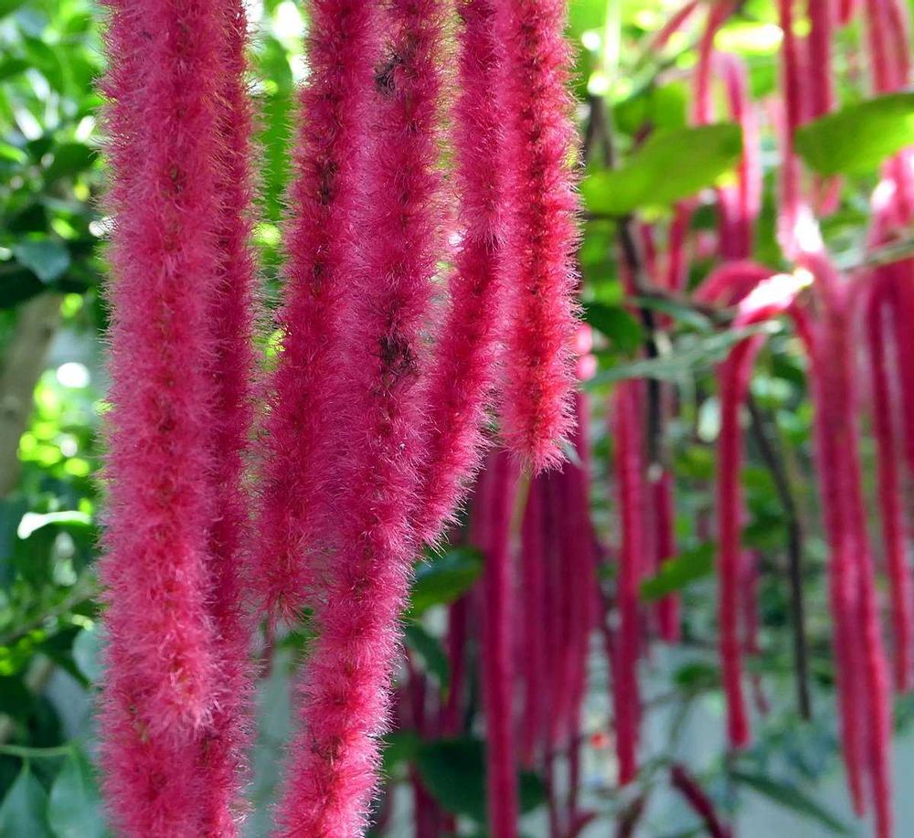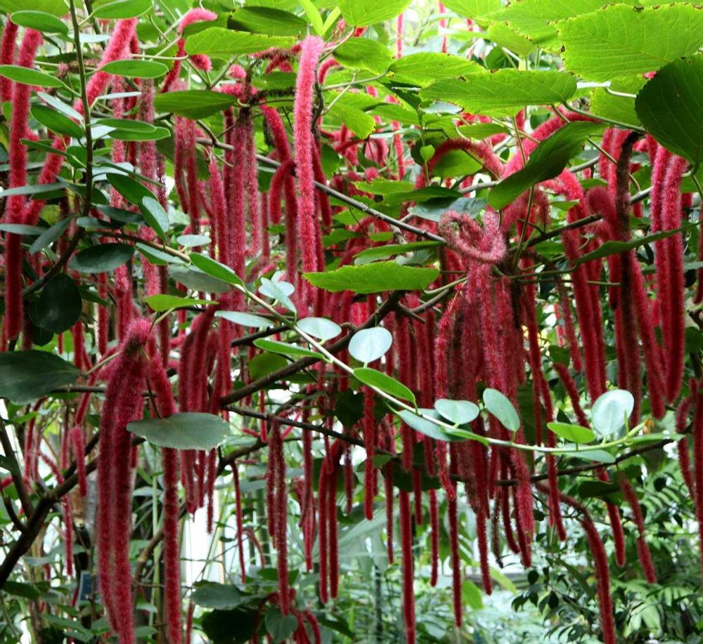 花序は長さ15~50㎝の穂状で、垂れ下がる。その姿から「紅色の紐」を意味する名が付いた。