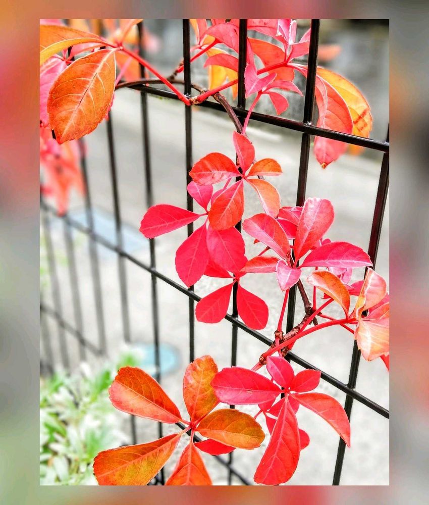 フェンスに絡み付いているヘンリーヅタが真っ赤に紅葉して綺麗です💖🍂💖