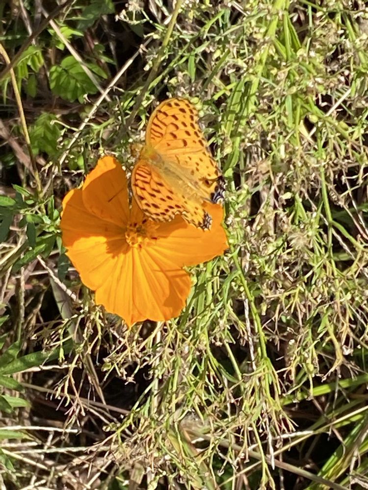 キバナコスモスも風に吹かれて咲いていましたが…お客様が🦋(ツマグロヒョウモン)