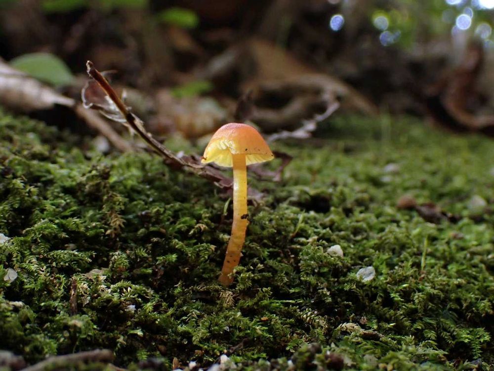 周りの苔のボケ具合ときのこの傘の上への反り具合が海中みたい🌊