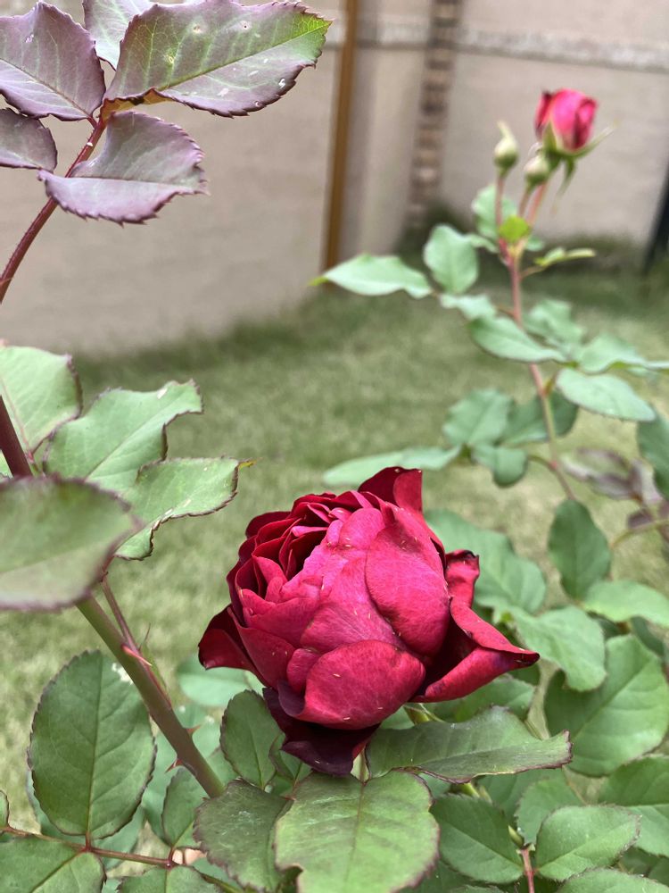 ドミニクマサドさんのソムリエールです🌹ちょこっとだけ咲きました😆✨ニュアンスカラーって言うのかな😊この赤、なかなか絶妙なニュアンスですよね💕来年はもっと上手に咲かせたいです🥰