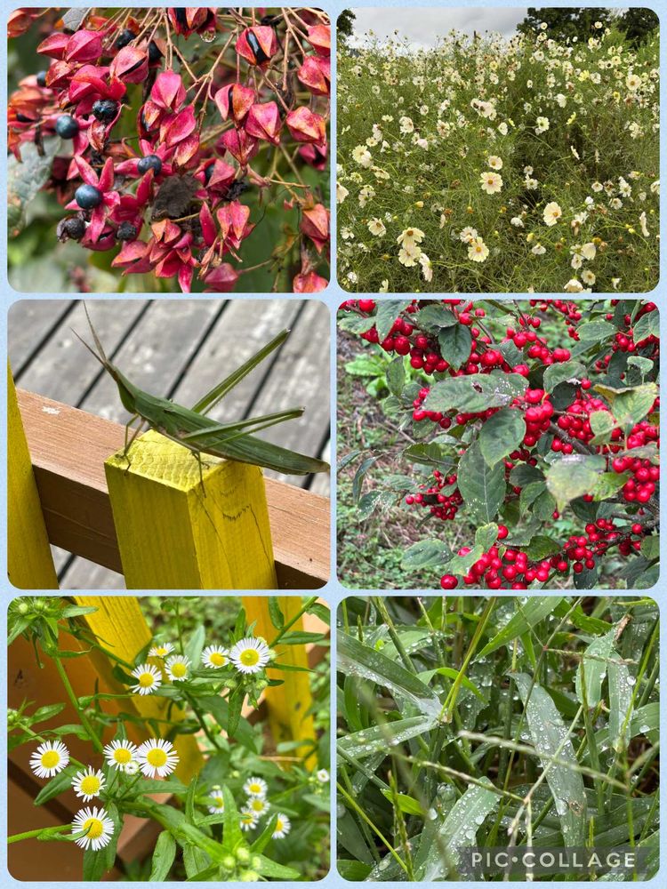 白いコスモスやヒメジオンがあったり、赤い実が秋🍂らしいなと。