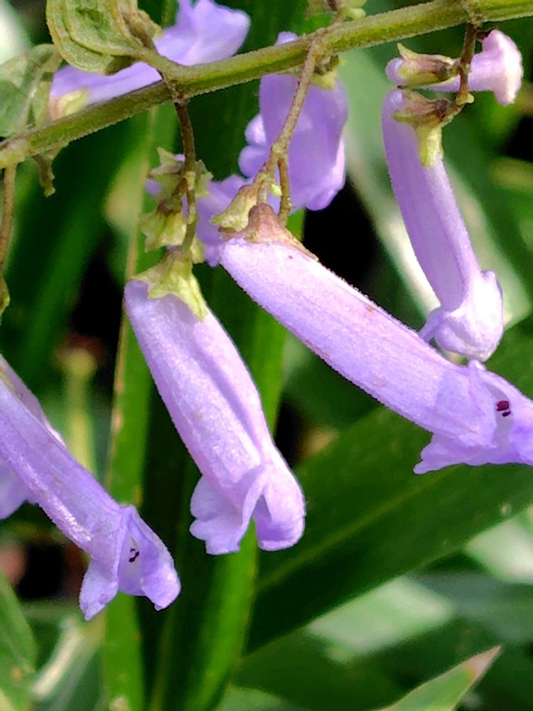 集散花序を出し、長さ1〜2.5cmになる花柄の先に青紫色の花を多数付ける。