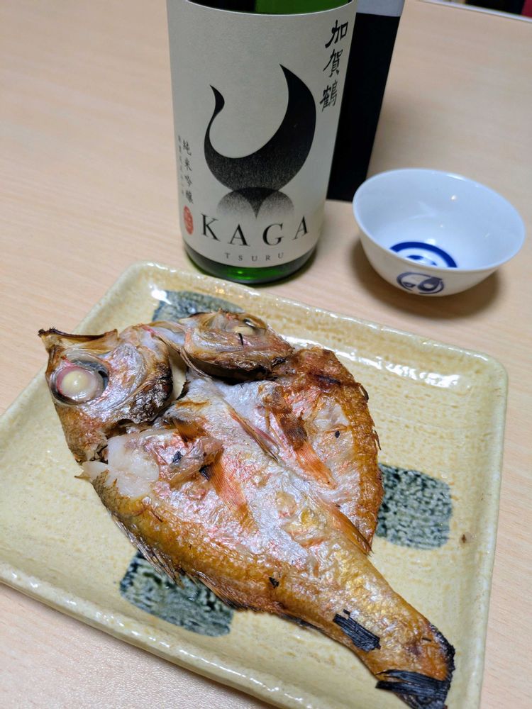ノドグロの一夜干しと金沢の『やちや酒造』の『KAGA鶴』能登杜氏のスター四家(しやけ)さんの作った純米吟醸。