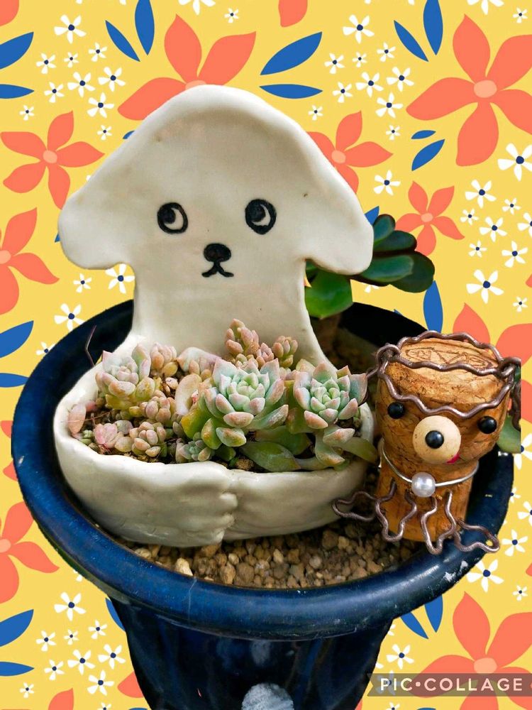 おとぼけ顔のワンちゃん鉢 大事そうに多肉さんをかかえてるのね ゆる〜い感じが愛嬌あって😄👍です‼️