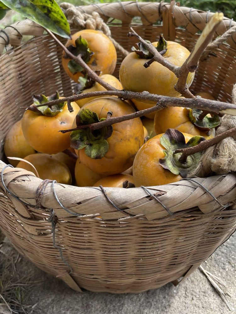 ②多分江戸時代からあるめごに入れた実家の柿。「目籠」とは、竹などで目を粗く編んだ、物を入れて運んだり洗ったりするための籠のことです。