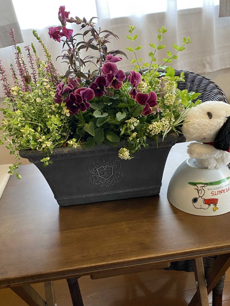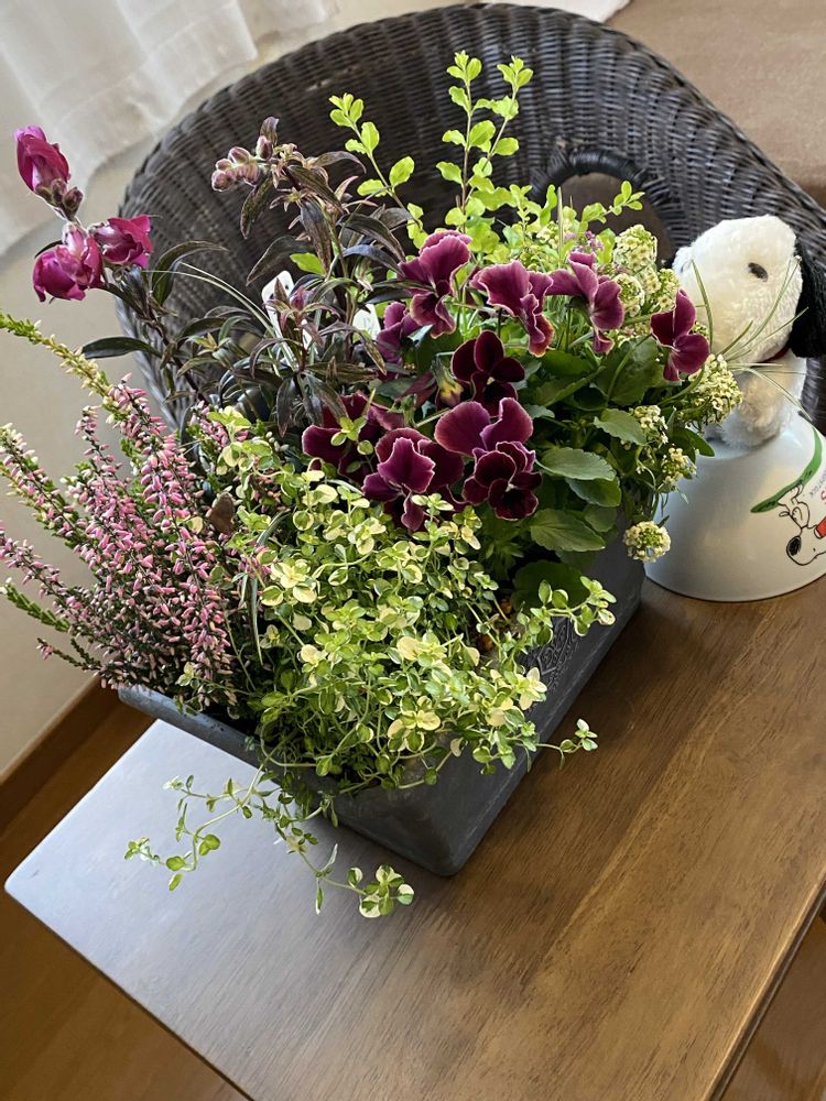 今年も例年通り10月に園芸店の寄せ植えイベントに参加して来ました。今回もパンジーとアリッサム、カルーナを店内の好きなのに変えて良かったので、3種とも変えさせてもらいました、パンジーはシエルブリエから和楽にして、金魚草と色を揃え、カルーナも八重咲きからふつうの高さのあるカルーナに。アリッサムは真っ白ではなくベージュがかった色にして、鉢の雰囲気と合わせてみました。(浅はかながら私なりに色々考えるのが楽しかったです)