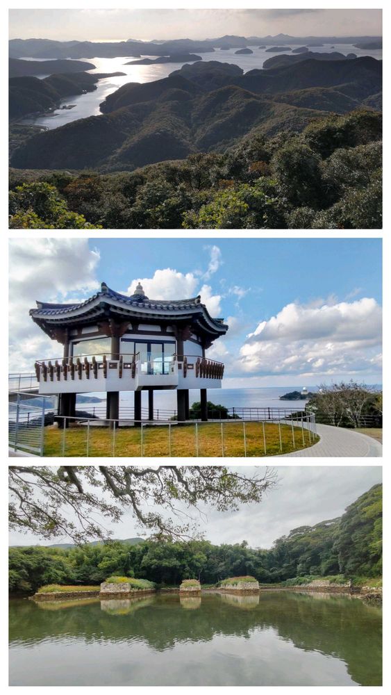 ②リアス海岸の浅茅湾、韓国展望台、お船江跡