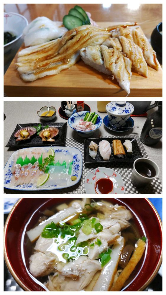 ⑤対馬の幸も堪能。上:ランチはあなご寿司。中:民泊の海鮮はどれも絶品でこの他にあなごフライやイカの天ぷらも。対馬の日本酒「白嶽」もサービスしていただきまして幸せ。下:お酒を飲まれる方は最後がいいわよね?と、締めに郷土料理の「ろくべえ」のお吸い物もいただきました。サツマイモを発酵させて作る「せんだん」から蕎麦みたいな形状に仕上げるそうです。不思議な食感で美味しかったなぁ😋