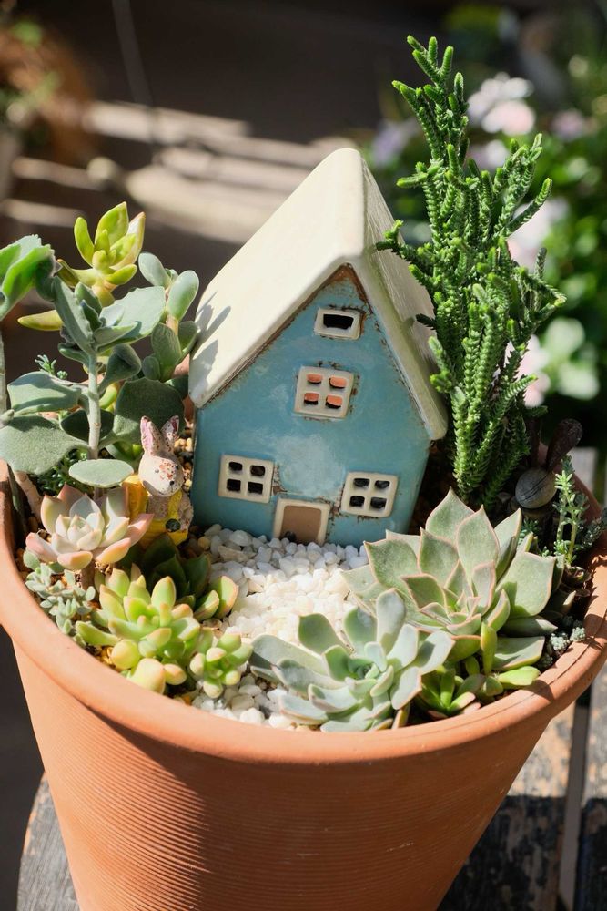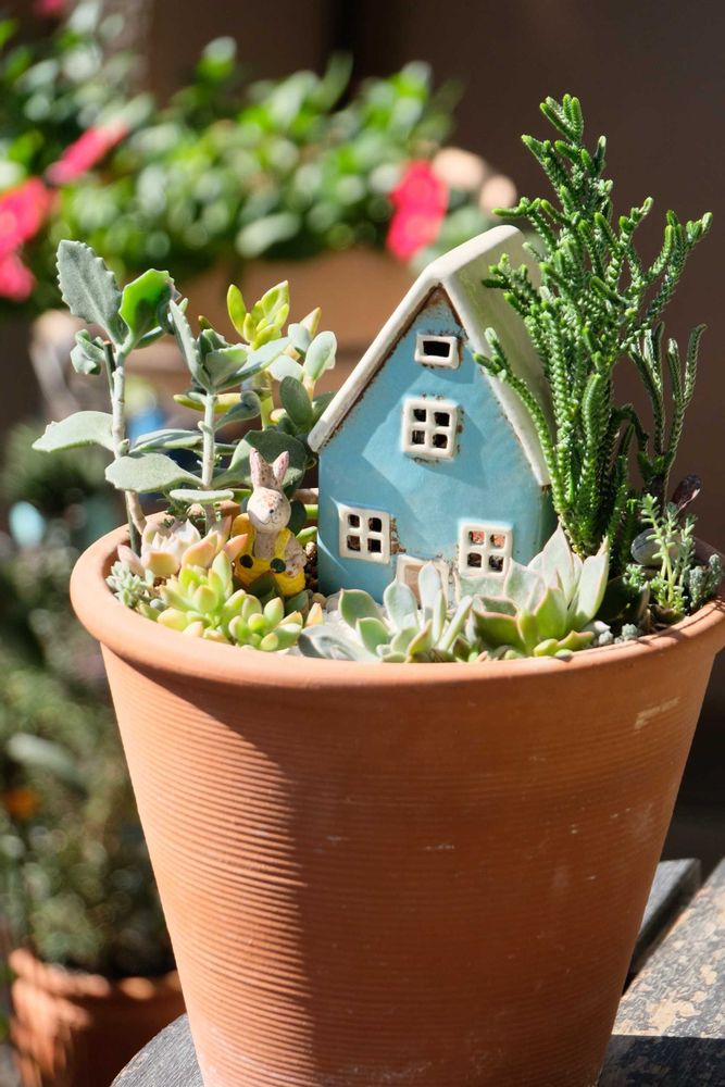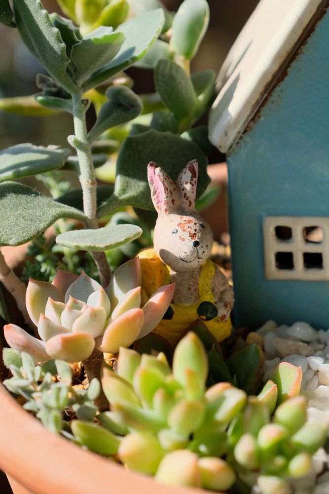 小さめのエケベリアも可愛くて、さりげなくいるウサギ🐇さんも💖