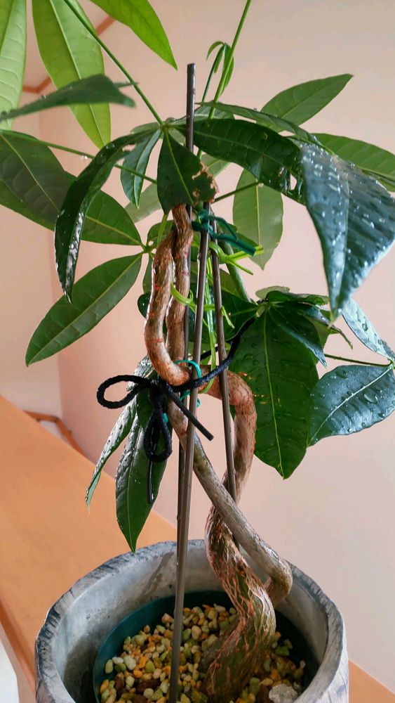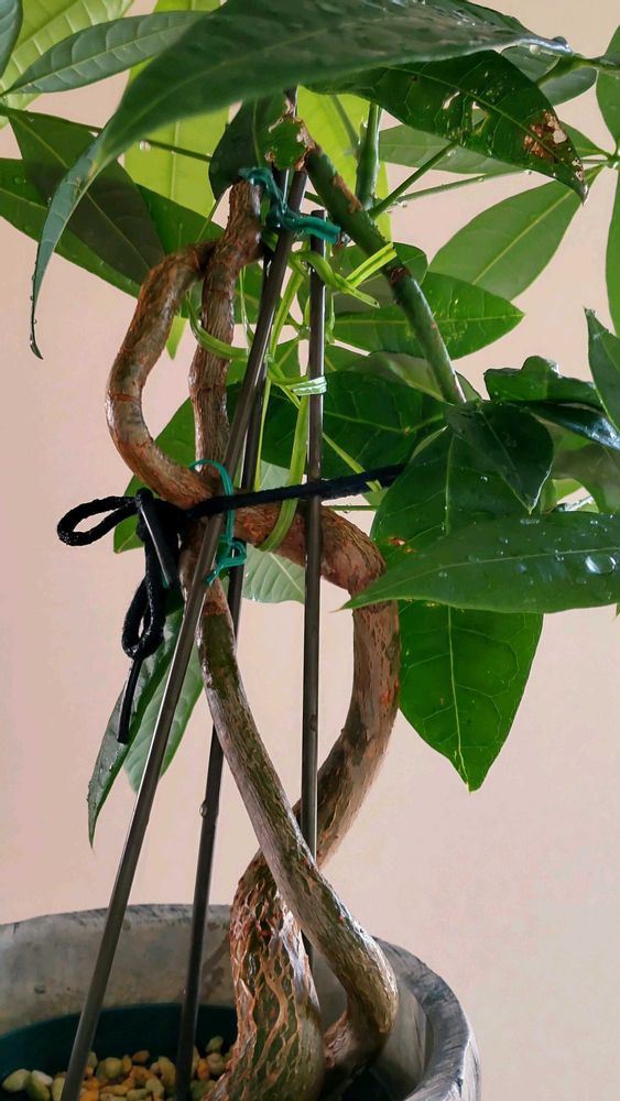 クネクネと曲がったパキラを買っていたのだけれど途中から真っ直ぐ伸び始めたので紐で引っ張てみた。なんだかゴチャゴチャしているね😅