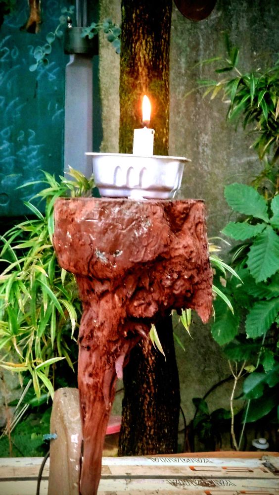 数年前に掘り出した根っこでロウソク立を作りました、、大災害で停電した時に役立つかな😅