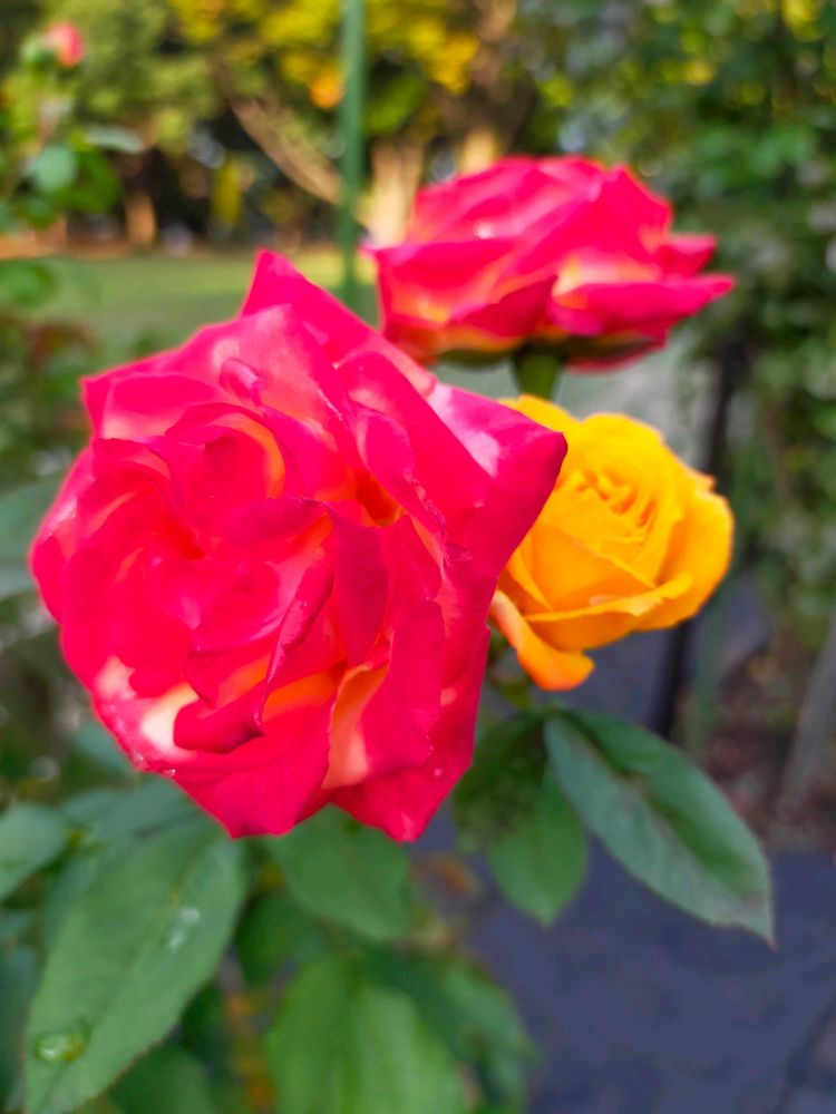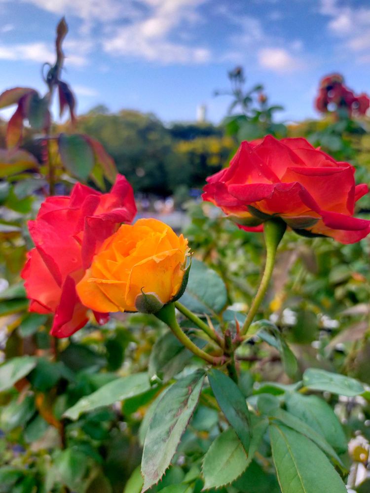 赤と黄色のバラが同じ株に