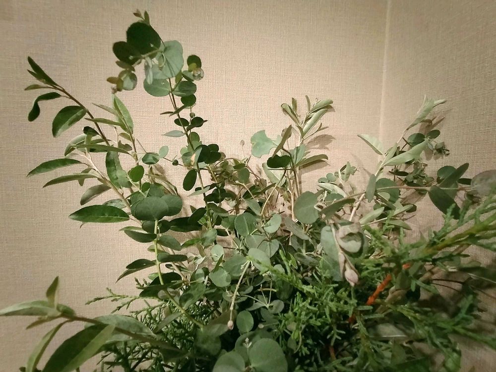 近所のスーパーでスワッグ用にとユーカリ等の枝が売っていたので。柑橘系の香りと合わせて玄関がいい香りです。