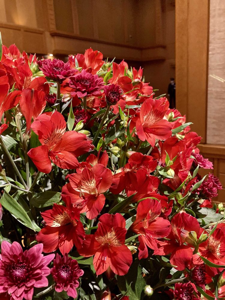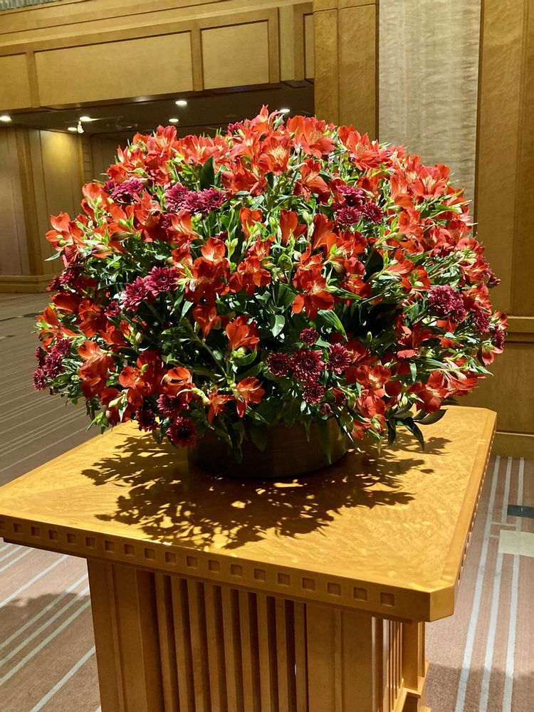帝国ホテル東京の宴会口の装花は赤花「アルストロメリア」の可愛いドームでお出迎え。