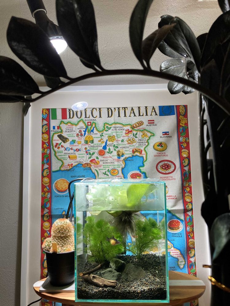 今朝旦那は近所から石と木を拾ってきて、グツグツ茹でてから、水槽に飾りました。
