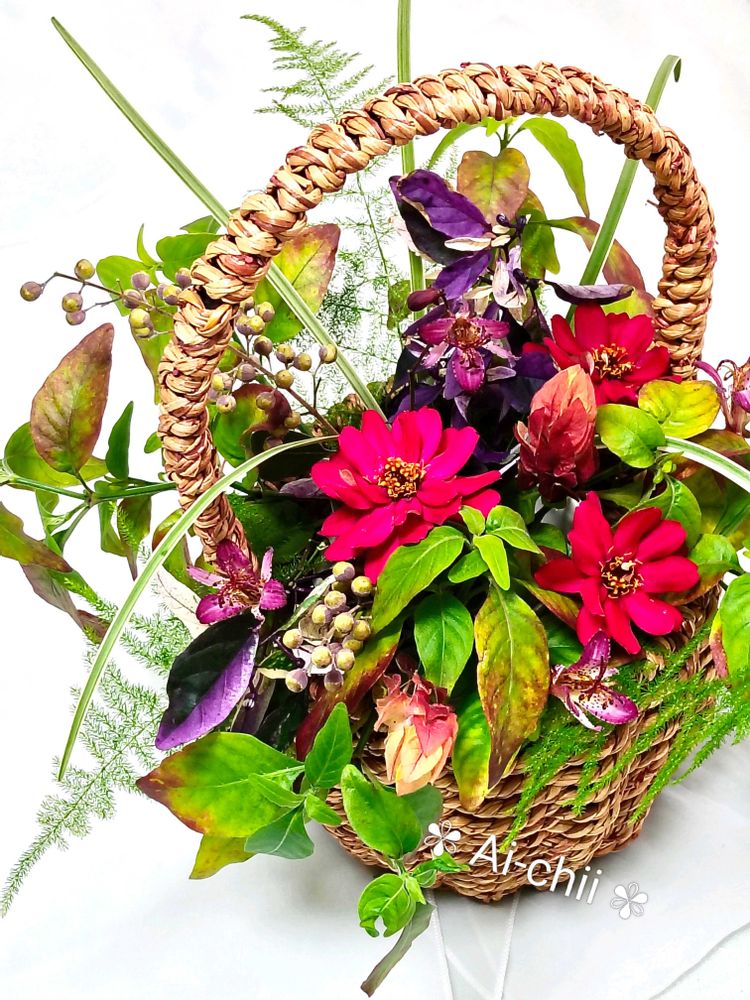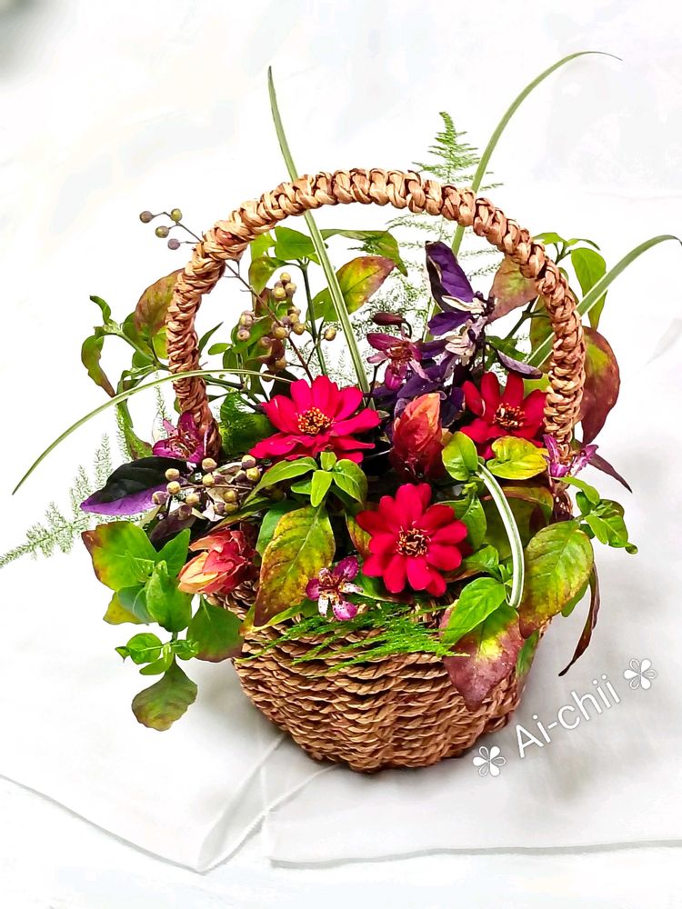 勝因はカゴと花材とのバランスと、豊富な花材の種類ですね。庭からの植物でこんなに揃うなんて、羨ましい限りです。