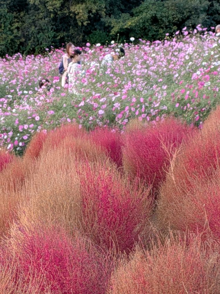 一昨年は、蕎麦の紅い花もあって感激したのですが、今年は残念ながらありませんでしたが、一面のコスモスや可愛いコキア等に出会え大満足で帰ってきました。