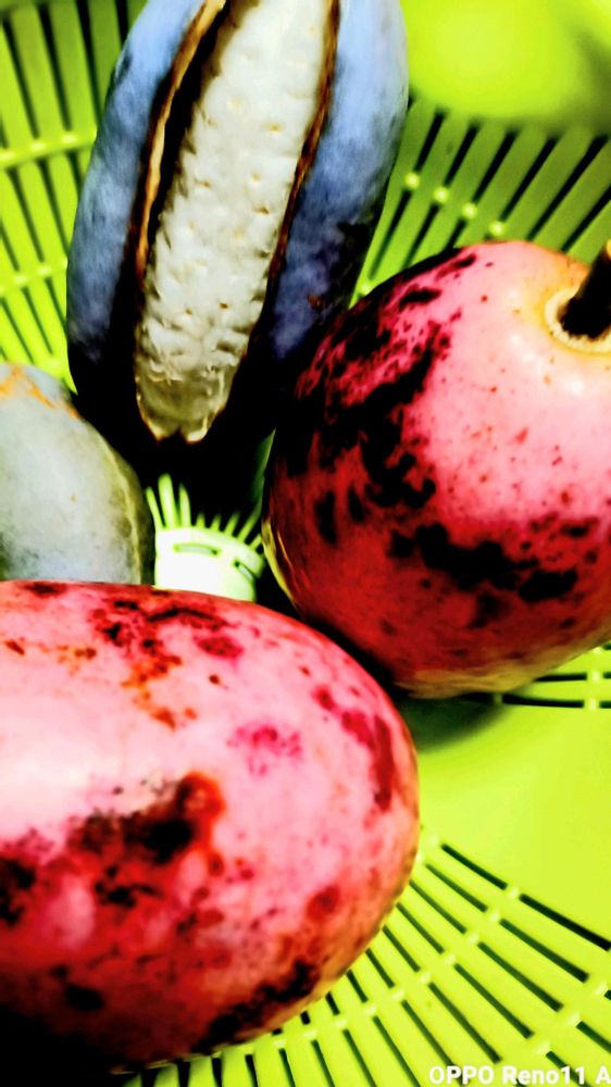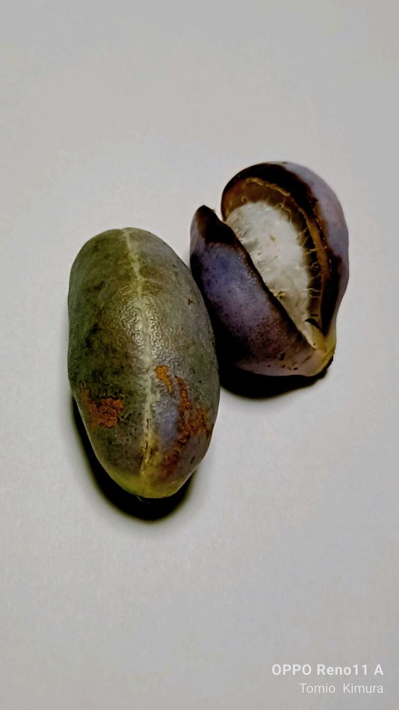 家主さんの許可を得て、アケビとムベを頂きました。弾けるのがアケビ(最初の写真)で、二枚目の写真の赤い大きい弾けて居ない実がムベです。