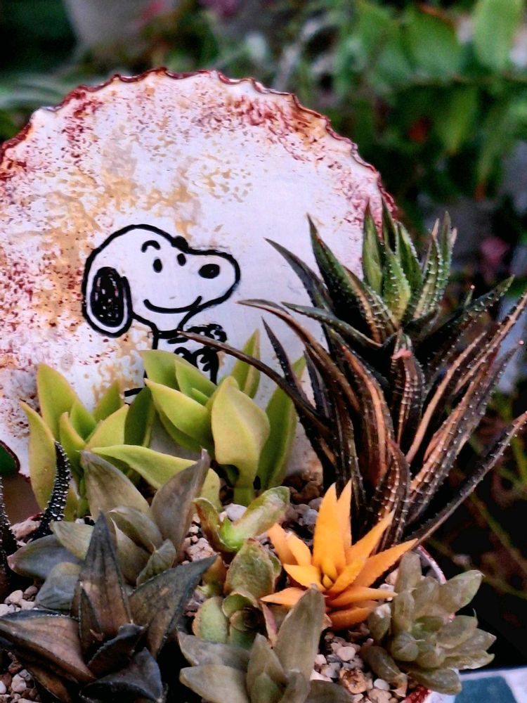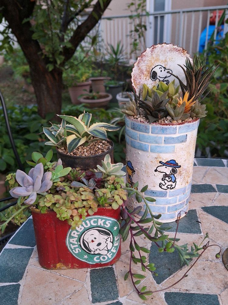 ①さくら餅子さんの赤いスヌーピーリメ缶の寄せ植えと、ハオルチアの寄せ植えの自作スヌーピーリメ缶と、五色万代の子株が植えてあるサビサビ缶😆
