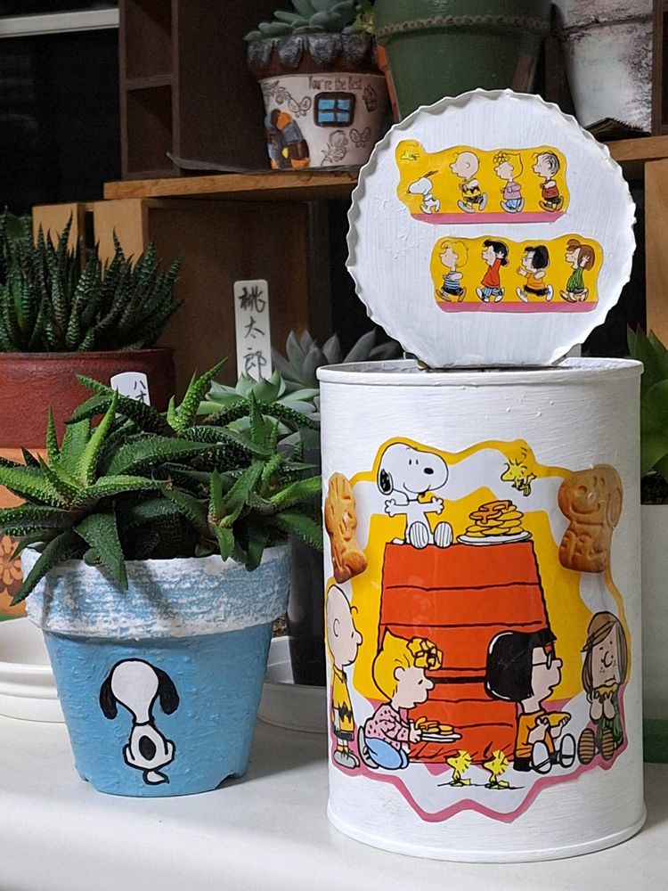 ④スヌーピーの後ろ姿のリメ鉢と、制作途中のリメ缶😃