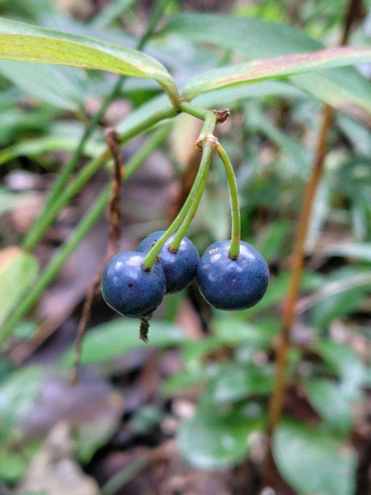 果実は直径約1cmのほぼ球形の液果で青黒色に熟す。