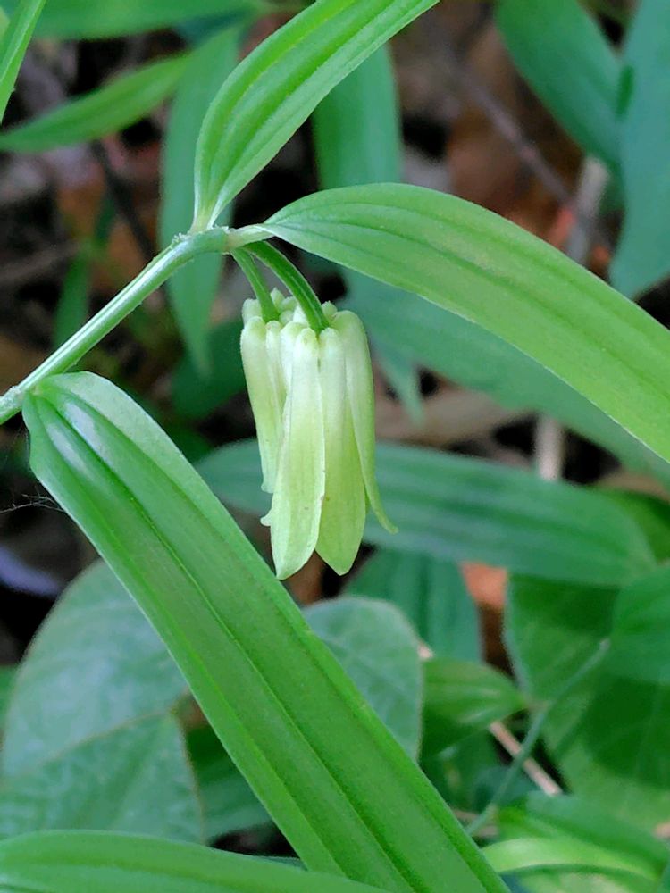 茎は上部で2〜3つに分枝して斜上し、その茎頂に1〜3個の花をつり下げる。(④ 5/1 三ツ堀里山自然園にて撮影)