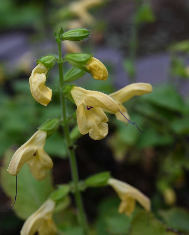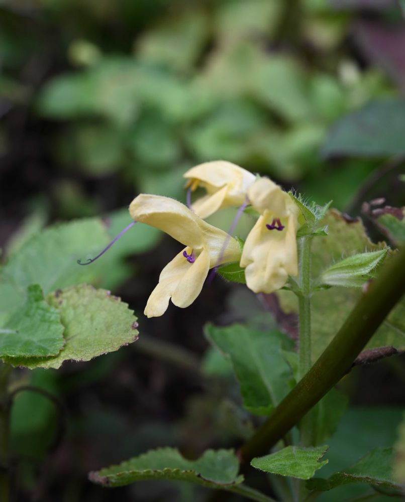 茎の先に花穂をだし、長さ2.5〜3.5cmの淡黄色の唇形花を数段つける。