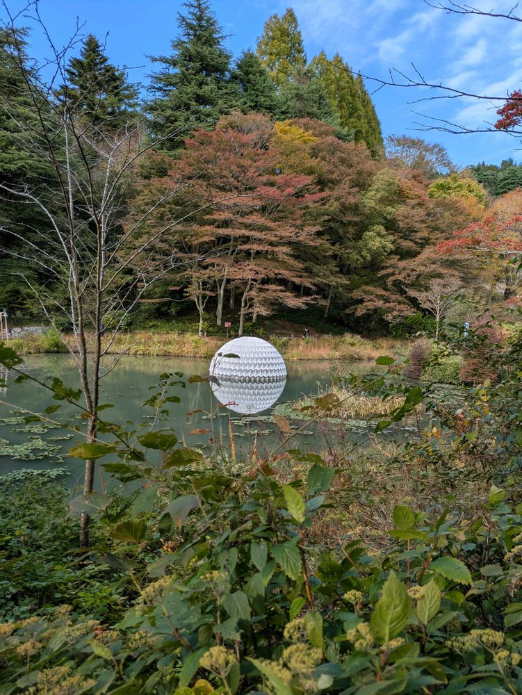 この白い球体は、建築家 遠山之寛(ゆきのぶ)氏の作品。池に石灰石由来の紙で作られた半球状の作品を置いて、球体に見えるようにしています。②は解説の方