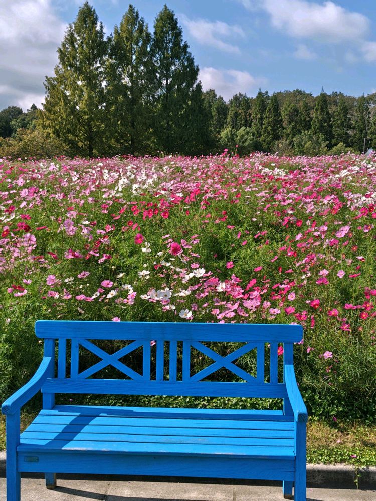 おはよ🌸ブルーのベンチとコスモス目を引くね!