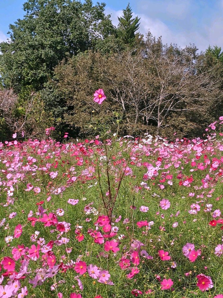 ベンチにコスモス🩷💗メルヘン(’-’*)♪