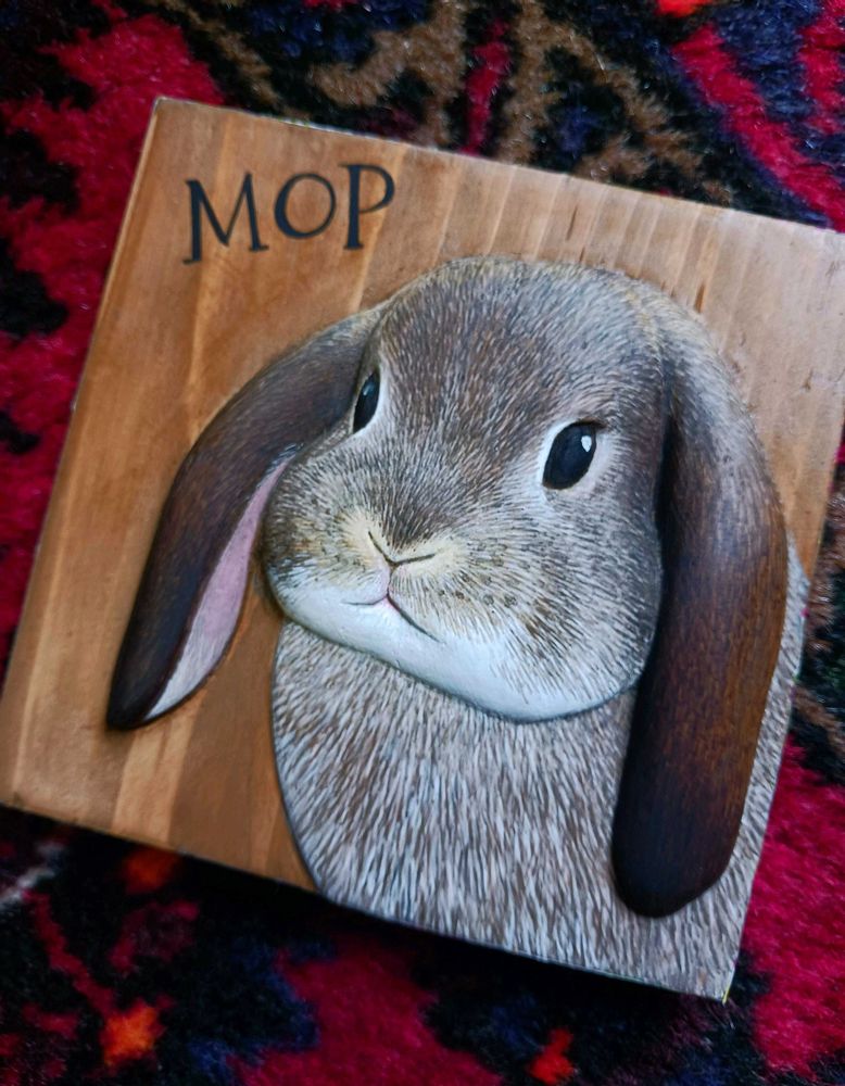 ④夏のパーティーのビンゴゲームの賞品「みどりさんがアナタのペットを木彫りのレリーフにしてくれる券」を選んでくれた小学生のオーダーはロップイヤー兎のモップちゃん。毛色が掃除用具のモップみたいだからだそうだけど😅