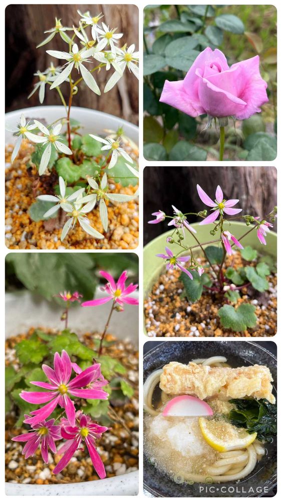 左上、下は大好きなダイモンジソウお迎えしました💖右上はブルームーン🌹GSにご縁を頂き2年目くらいで一目惚れした子。育てて4年目くらいになるけど頑張ってお花咲かせてくれています💖右真ん中は淡いピンクのダイモンジソウ✨近くのお友達からのプレゼントです🌸右下は、お気に入りのうどん屋さん🍜大根おろし、レモン、ネギ、わかめ、ちく天乗せて🍜温かくて美味しかったです^_^🎶💖